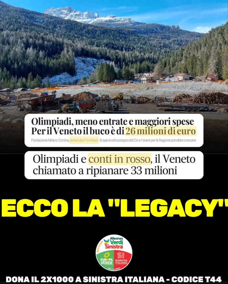Per il segretario provinciale di Sinistra italiana/Avs, Paolo Perenzin: “Si sono chiesti sacrifici ai territori dicendo che ci sarebbero stati benefici diffusi, ma cosa rimane oggi davvero alle comunità locali? Non possiamo raccontare solo le medaglie, nascondendo un modello che ha danneggiato i residenti. Servivano investimenti strutturali per la vita delle persone, per la mobilità pubblica, per la sanità di prossimità, per la sicurezza idrogeologica e per un turismo sostenibile. Noi lo abbiamo denunciato da sempre e, per questo, venivamo tacciati di essere disfattisti e, come disse Zaia, “portasfiga”. Fa sorridere che ora, a conti fatti, sia partita la gara a dissociarsi dalla “legacy” di queste olimpiadi e siamo costretti ad assistere alle lacrime di coccodrillo di chi, come per esempio il Bard e il suo presidente, Andrea Bona, prima magnificava in lungo e in largo la bontà dell’eredità olimpica per il territorio ed oggi, invece, finge di essere sempre stato contrario”.