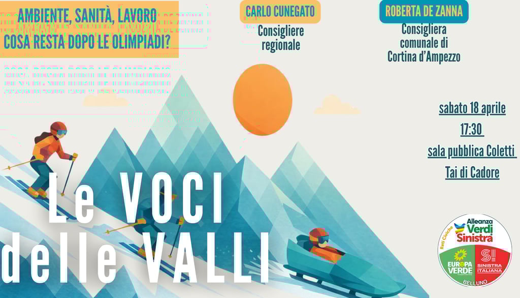Relatori per l’occasione saranno il consigliere regionale AVS Carlo Cunegato e la consigliera comunale di Cortina d’Ampezzo Roberta de Zanna. Sarà l’occasione di discutere dell’eredità olimpica, del lascito immediato e delle prospettive future per le valli ampezzane e cadorine dopo i giochi e della possibilità che un grande evento di questo tipo possa essere il volano di rilancio demografico e sociale di un territorio montano come il nostro. Sarà, inoltre, l’occasione per illustrare la proposta di legge regionale recentemente presentata dallo stesso Cunegato sul salario minimo. La discussione, intitolata “Ambiente, sanità, lavoro. Cosa resta dopo le Olimpiadi?” verrà moderata dal segretario provinciale di Sinistra italiana/Avs, Paolo Perenzin.