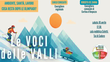 Sabato 18 aprile, alle ore 17:30 presso la sala pubblica Coletti di Tai di Cadore, si terrà il secondo appuntamento del ciclo di incontri di Alleanza Verdi Sinistra intitolato “Le Voci delle Valli” per parlare dei problemi delle terre alte e discutere insieme ai cittadini proposte e soluzioni.